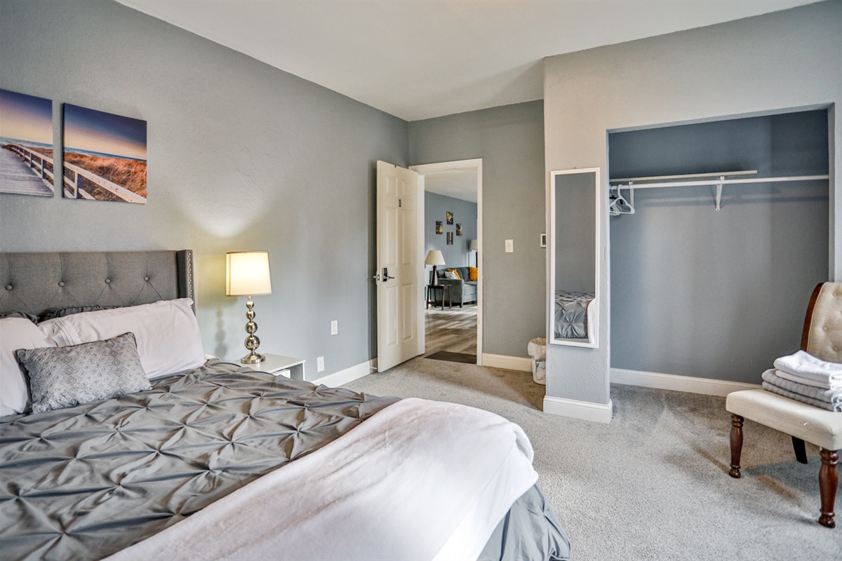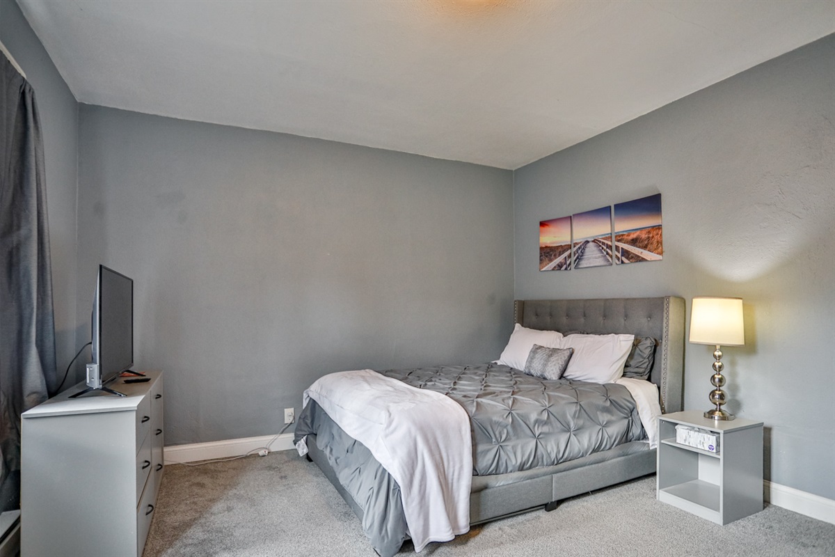 ✔ Private, keypad-secured room with queen bed, Smart Roku TV, dresser, closet, and blackout curtains