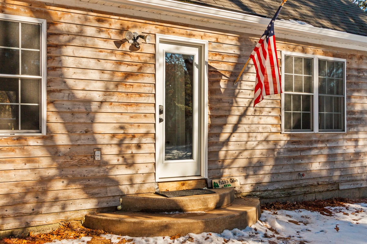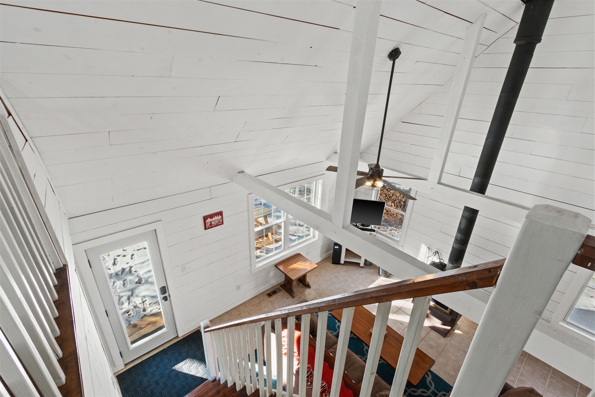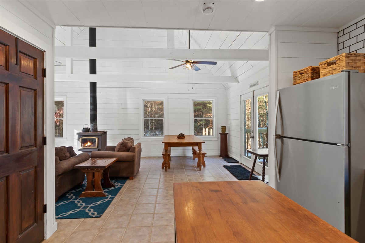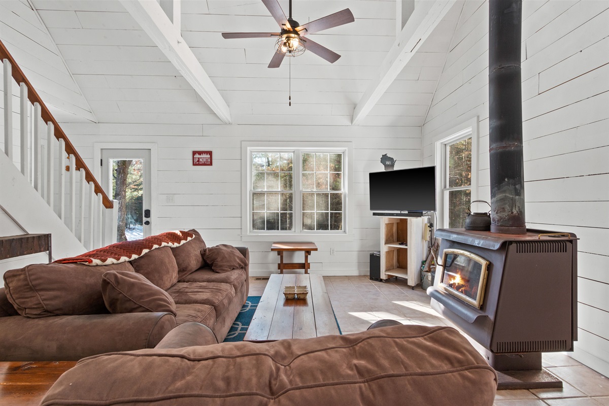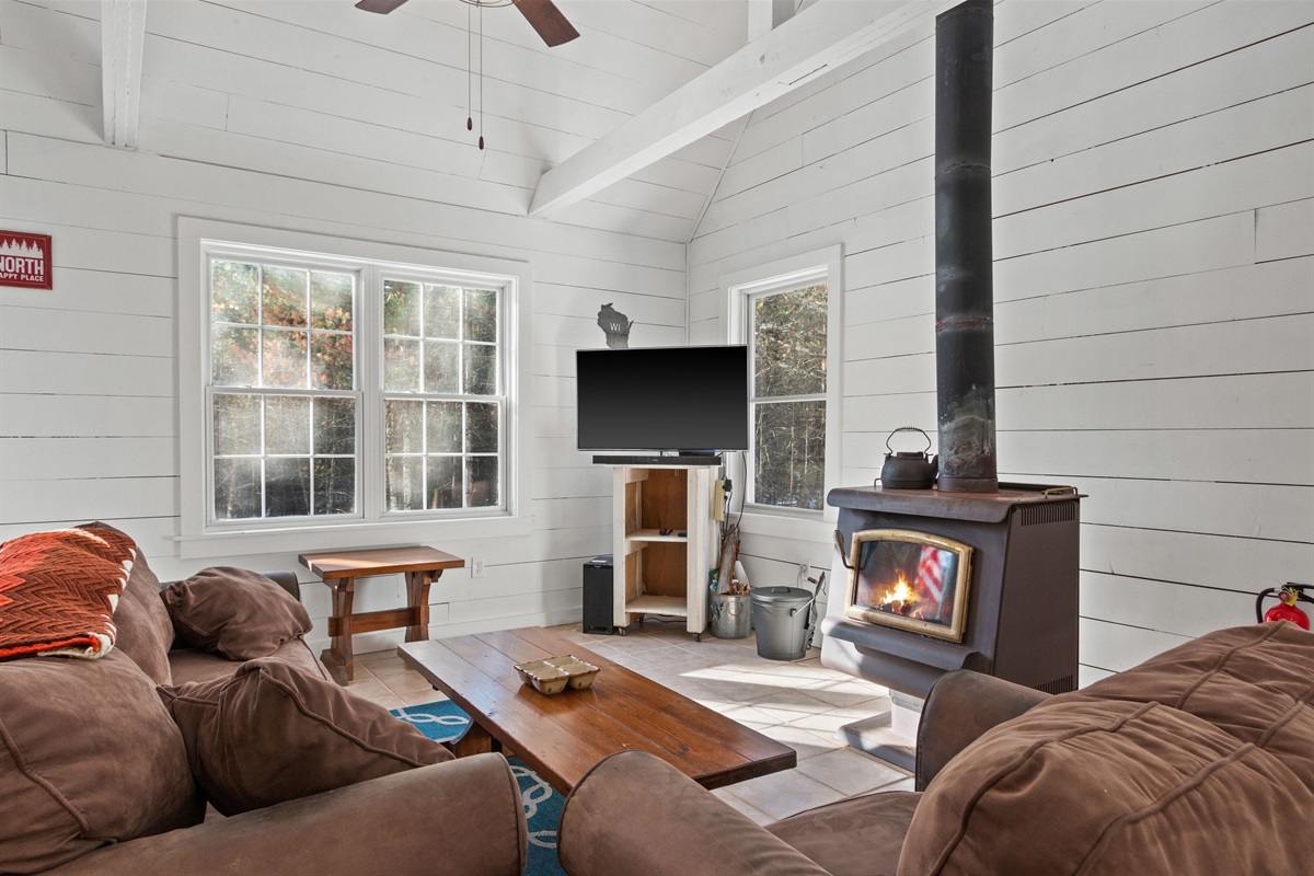 ✔ Vaulted ceilings, large windows & wood-burning stove for classic cabin vibes