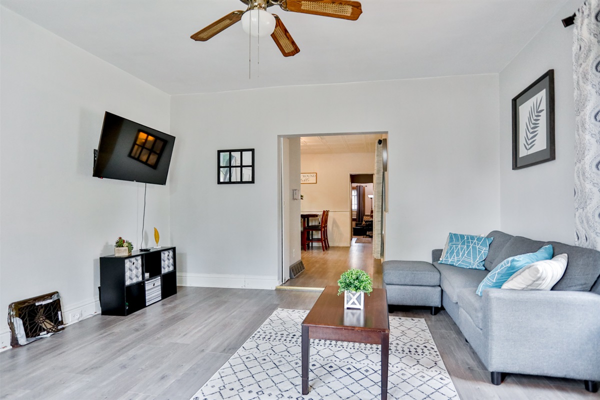 ✔ Living Room - Sofa, chairs, 48" Roku Smart TV, workspace desk