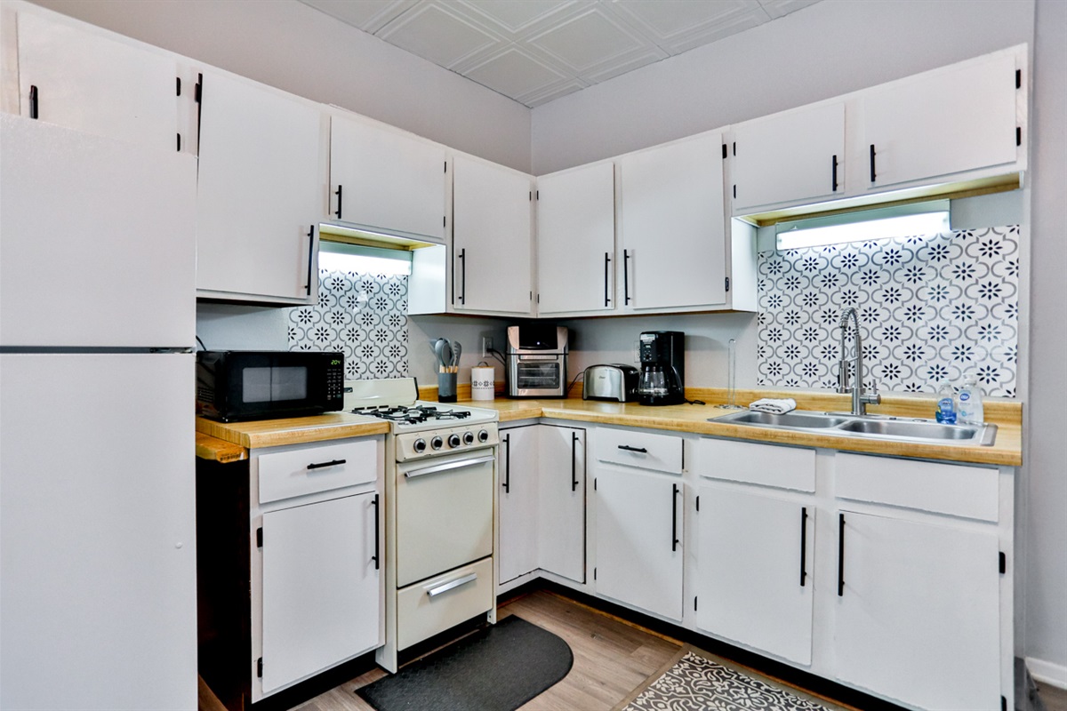 ✔ Kitchen - Refrigerator, stove/oven, microwave, toaster, coffee maker, crock pot, cookware, dishes, and cleaning supplies
